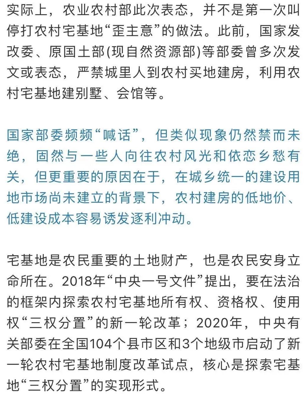 農業(yè)農村部相關負責人近日表示,要嚴格禁止城里人下鄉(xiāng)利用農村宅基地建設別墅大院和私人會館等,也不能以各種名義強制農民退出宅基地和強迫農民“上樓”。 近年來,隨著生活水平提高和美麗鄉(xiāng)村...