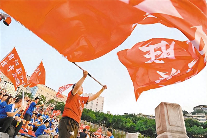 9月13日,大田灣體育場,“渝超”揭幕戰(zhàn)現(xiàn)場,球迷揮舞旗幟助威。記者萬難攝/視覺重慶 9月13日,渝中區(qū)大田灣體育場,來看“渝超”的球迷們熱情高漲。記者鄭宇攝/視覺重慶 9月...