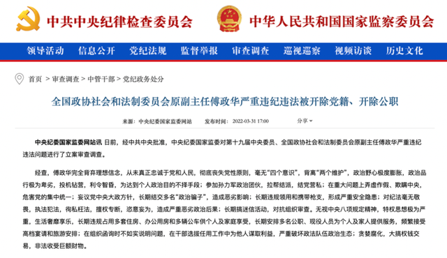 3月31日下午,中央紀委國家監(jiān)委網(wǎng)站發(fā)布消息,第十九屆中央委員、全國政協(xié)社會和法制委員會原副主任傅政華被開除黨籍、開除公職。 今年67歲的傅政華,在公安系統(tǒng)任職48年,曾任公安部...
