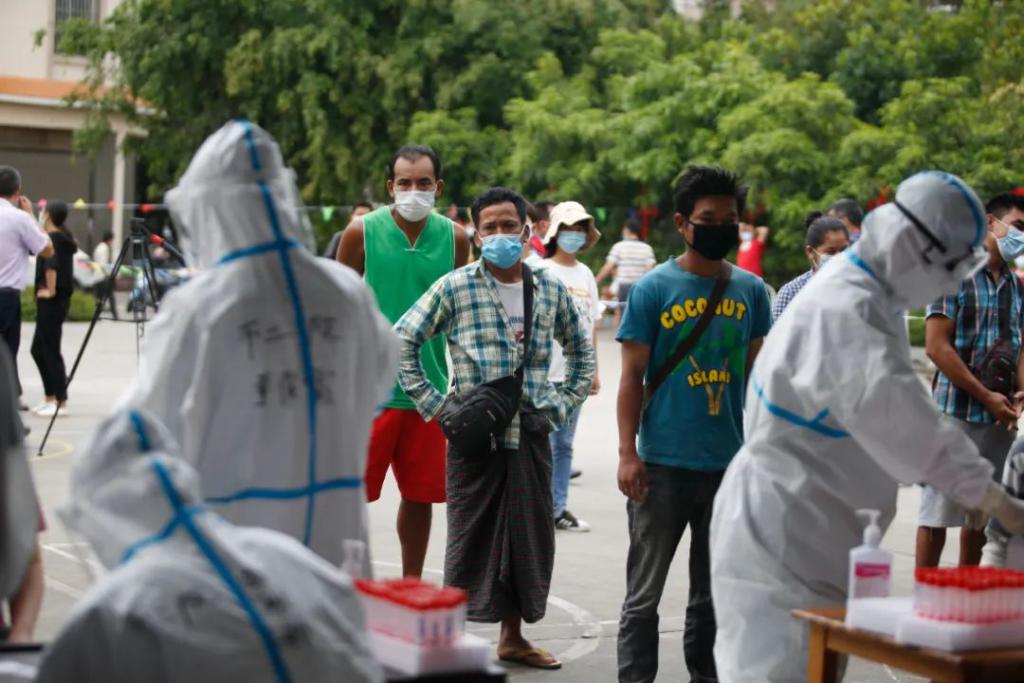 2020年9月,云南省瑞麗市,幾位緬甸籍居民排隊等候核酸檢測。 本刊記者/溫如軍馬銘澤 10月24日,在國務(wù)院新冠疫情聯(lián)防聯(lián)控新聞發(fā)布會的媒體直播間里,大量云南瑞麗網(wǎng)友留言表示希...