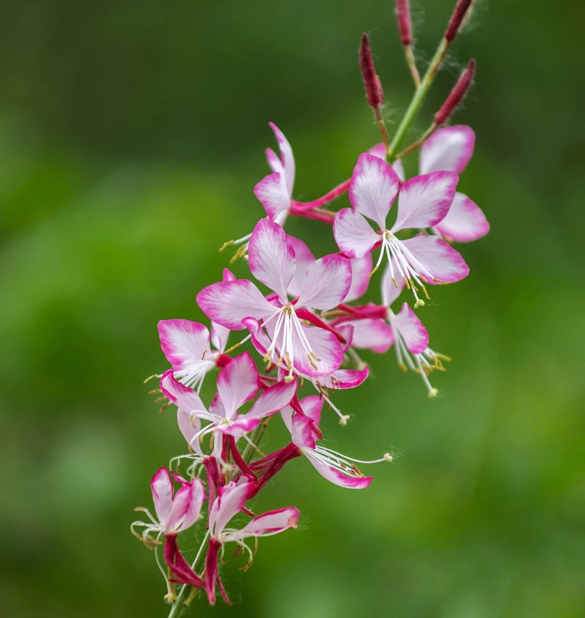 葉片細(xì)長(zhǎng),呈披針形,顏色翠綠,為整株植物增添了一抹清新之感。而山桃草最引人注目的當(dāng)屬它的花朵;ǘ涑史奂t色,花瓣輕盈而細(xì)膩,形狀酷似桃花,卻又比桃花多了幾分靈動(dòng)。山桃草的花型小巧玲瓏,常常成簇開放,遠(yuǎn)遠(yuǎn)望去,就像一群粉色的蝴蝶在枝頭翩翩起舞,故有 “白蝶花” 之稱。山桃草的花期較長(zhǎng),一般從春季一直持續(xù)到秋季。在這段時(shí)間里,它不斷地綻放著美麗的花朵,為大自然增添了一道亮麗的風(fēng)景線。無論是在公園、花園,還是在野外的草地、山坡上,山桃草都能成為人們眼中的焦點(diǎn)。
