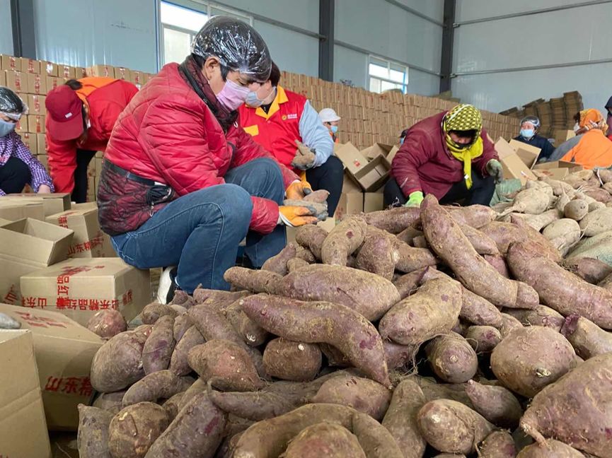 ▲山東臨沂的紫薯商家正在分揀、打包和發(fā)貨。因?yàn)槿サ袅酥虚g商環(huán)節(jié),拼多多助農(nóng)直播中的紫薯價(jià)格一度達(dá)到了10斤15元的超高性價(jià)比。