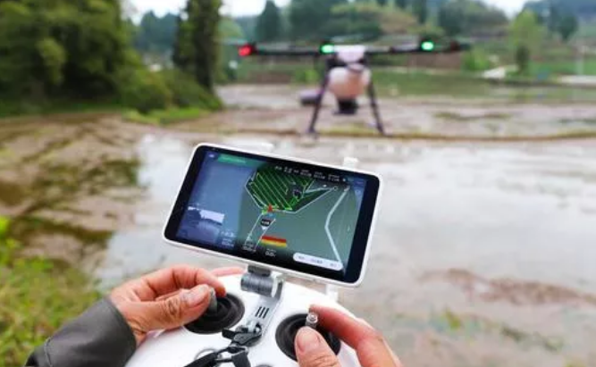 梁平區(qū)碧山鎮(zhèn)川主村四組,工作人員操作無(wú)人機(jī)在平整好的田塊上進(jìn)行水稻播種。