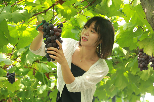 三伏天里,驕陽似火,許多市民待在空調(diào)房里,不愿出門,然而位于江津區(qū)鼎山街道仙池村的潤滋源果園卻熙來人往,笑語喧天,炎熱的天氣也無法阻擋市民前來采摘葡萄的熱情。男女老少手提竹籃,穿行在碩果累累、果香誘人的葡萄棚下,任意挑選,盡享從枝頭到舌尖的采摘樂趣。