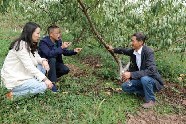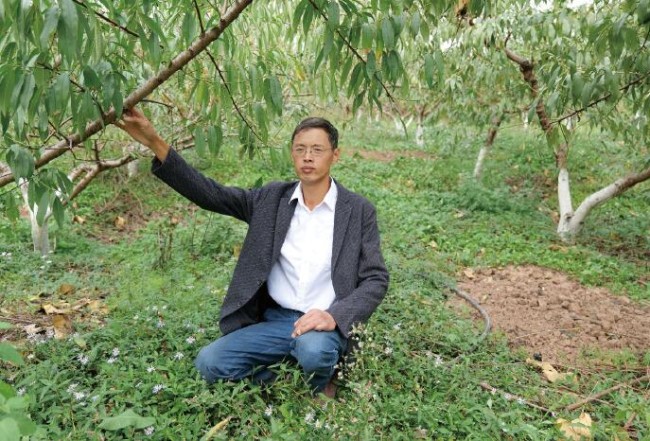 ▲ 瞿敬才在察看黃桃樹(shù)長(zhǎng)勢(shì)