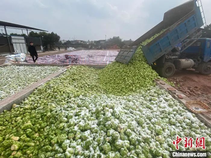 2月15日一大早,一輛裝滿新鮮青菜頭的大貨車到達重慶市永川區(qū)何埂鎮(zhèn)獅子村的腌制窖池,經(jīng)過稱重、驗貨后,青菜頭被倒入指定窖池。一旁,還有不少滿載青菜頭的大貨車、農(nóng)用三輪車、小推車等,排著隊等待卸貨。