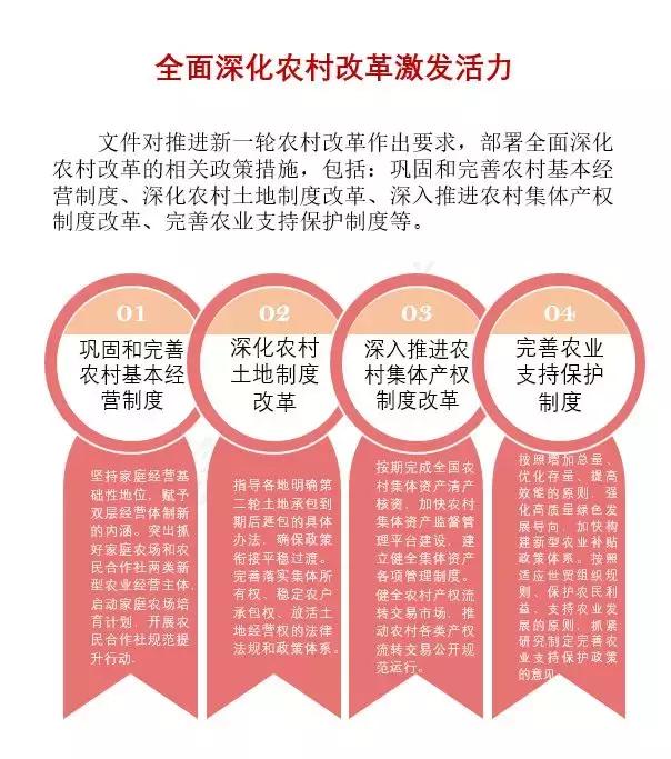 五要全面深化農(nóng)村改革,激發(fā)鄉(xiāng)村發(fā)展活力,鞏固和完善農(nóng)村基本經(jīng)營制度,深化農(nóng)村土地制度改革,深入推進農(nóng)村集體產(chǎn)權(quán)制度改革,完善農(nóng)業(yè)支持保護制度,加快構(gòu)建新型農(nóng)業(yè)補貼政策體系。