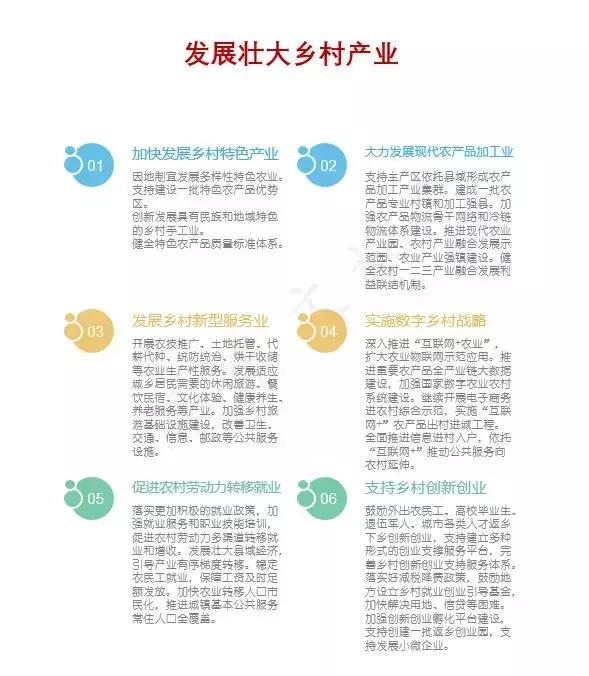 四要發(fā)展壯大鄉(xiāng)村產(chǎn)業(yè),拓寬農(nóng)民增收渠道,加快發(fā)展鄉(xiāng)村特色產(chǎn)業(yè),大力發(fā)展現(xiàn)代農(nóng)產(chǎn)品加工業(yè),發(fā)展鄉(xiāng)村新型服務(wù)業(yè),實施數(shù)字鄉(xiāng)村戰(zhàn)略,促進農(nóng)村勞動力轉(zhuǎn)移就業(yè),支持鄉(xiāng)村創(chuàng)新創(chuàng)業(yè)。