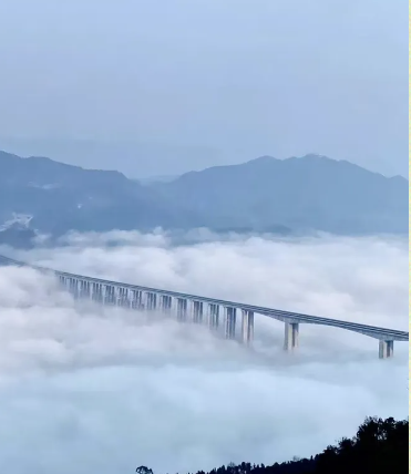 云霧與觀景口水庫、大橋、青山綠樹纏繞相映成趣,仿佛流動的巨幅畫卷