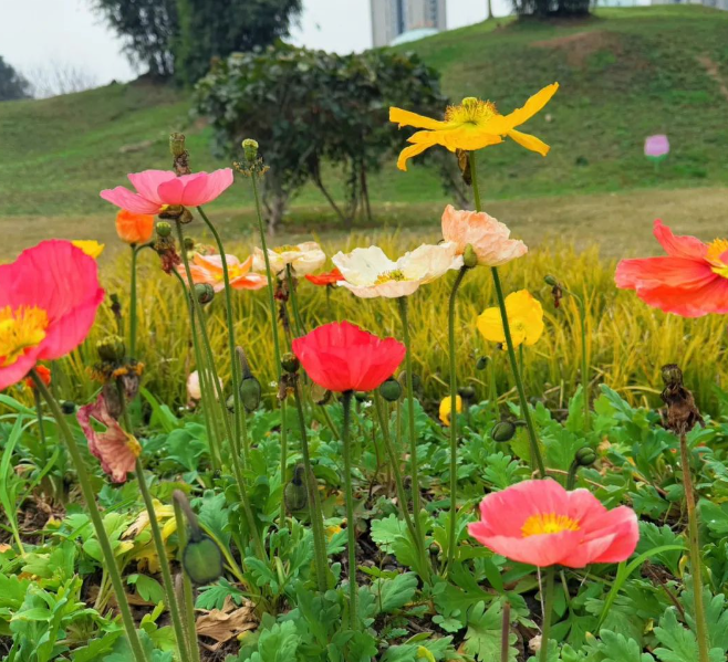 塔山公園是一個(gè)開(kāi)放式免費(fèi)公園從北入口進(jìn)入公園往左側(cè)賞月亭方向步行一眼被健身中心旁的一小片虞美人花海吸引住了目光