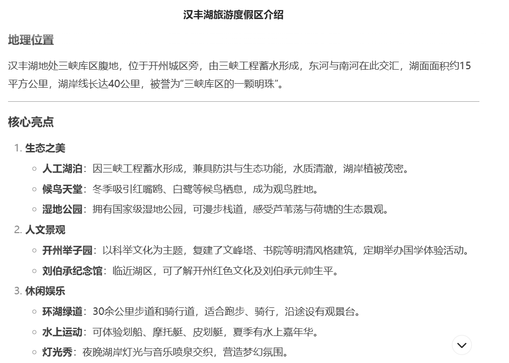 要說最近誰最火?火爆全球的頂流 非它莫屬👇👇👇原來我眼中的開州和DeepSeek眼中的開州是同一個(gè)開州哈哈,不錯(cuò)不錯(cuò)~ 在爆火全球的DeepSeek眼中 漢豐湖旅游度假區(qū)是什么樣的呢?讓我們一起來看看吧~