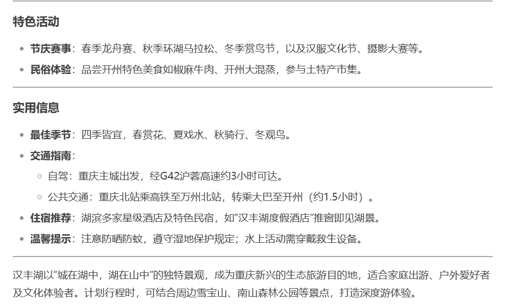 但deep seek眼中的開州永遠(yuǎn)也不及你實(shí)地觀看的壯美 這里有你向往的詩和遠(yuǎn)方也有你期待的美食與美景屏幕前的你一定要來看看DeepSeek眼中充滿詩意與壯麗的土地——漢豐湖旅游度假區(qū)