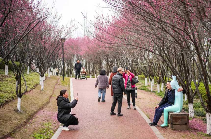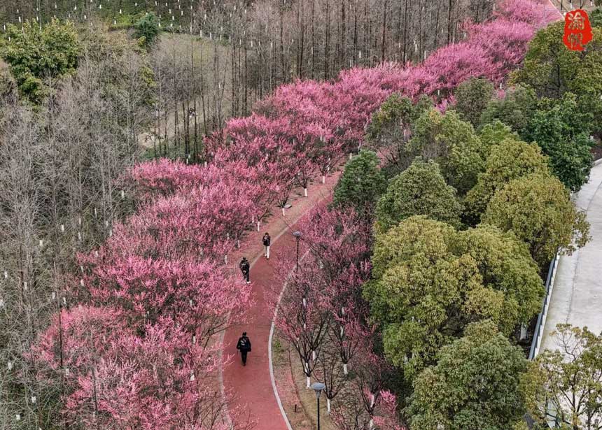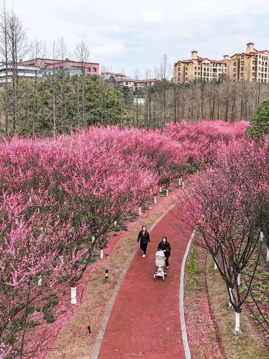 或許是今年受暖冬影響,渝帆在現(xiàn)場(chǎng)看到,這里的紅梅較往年早開(kāi)了一些,現(xiàn)在已有部分梅花化為粉雨紛飛,估計(jì)再過(guò)一周左右將至盛放尾聲,若想捕捉這里今年的最后一縷梅香,建議盡快前往。當(dāng)然若時(shí)間充裕,賞花之余,還可順道探訪公園內(nèi)的玉蘭、濱江路的十里桃林等景觀,甚至還可以騎行至悅來(lái)江灣,感受“一江春水映花影”的寫(xiě)意。