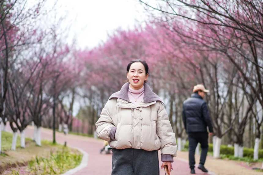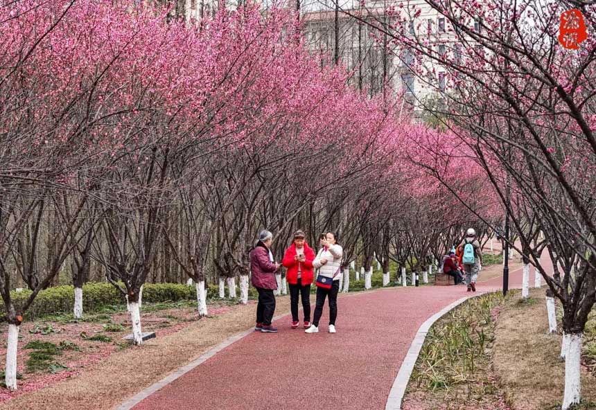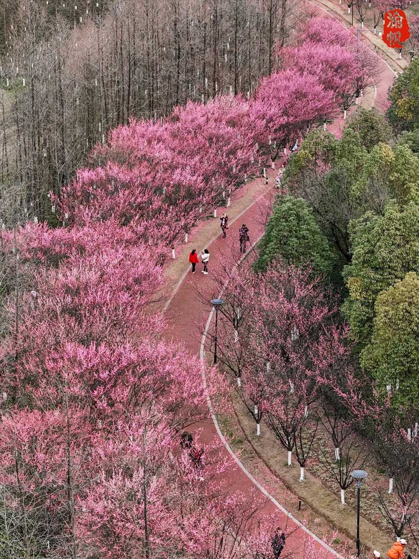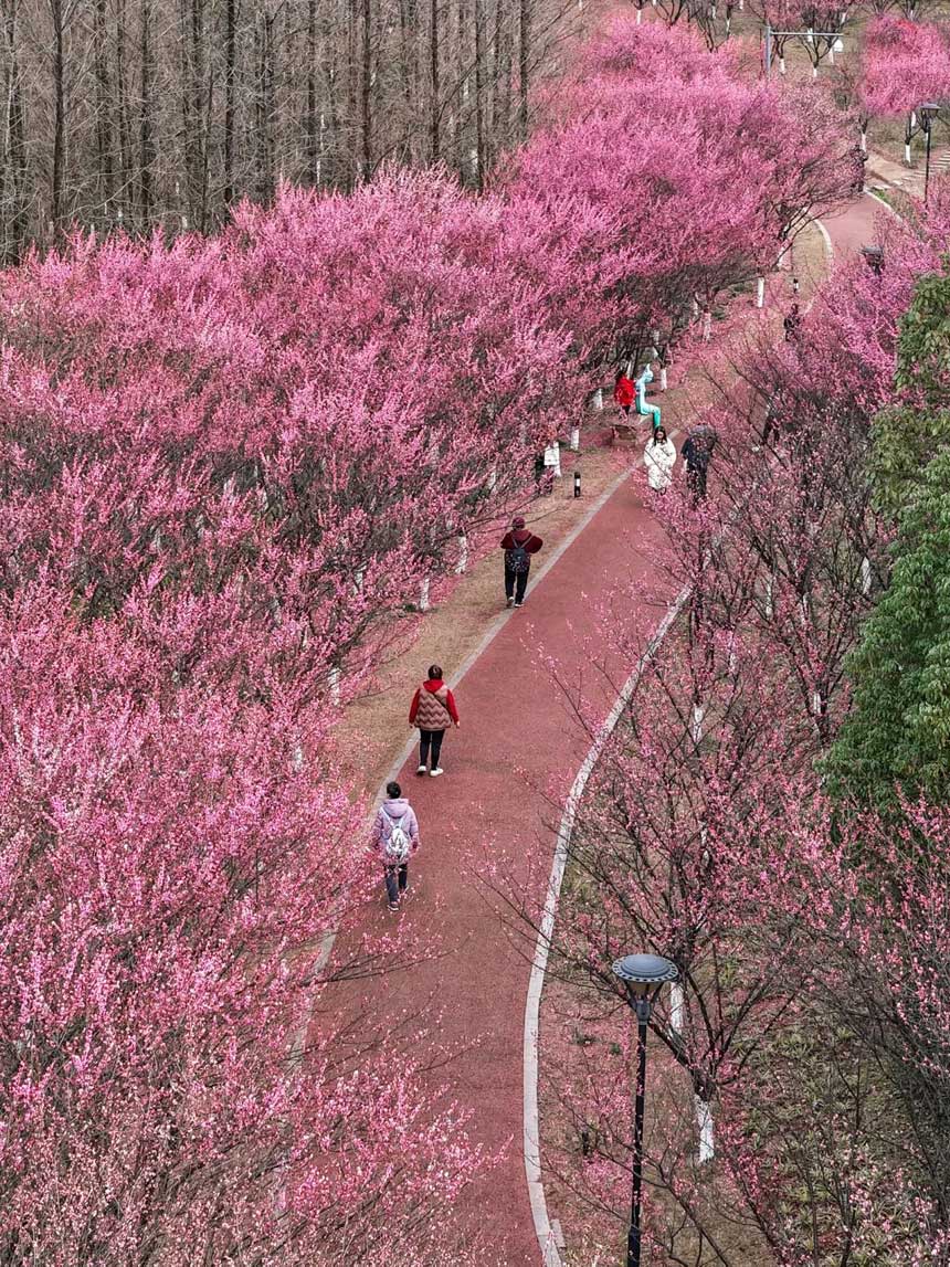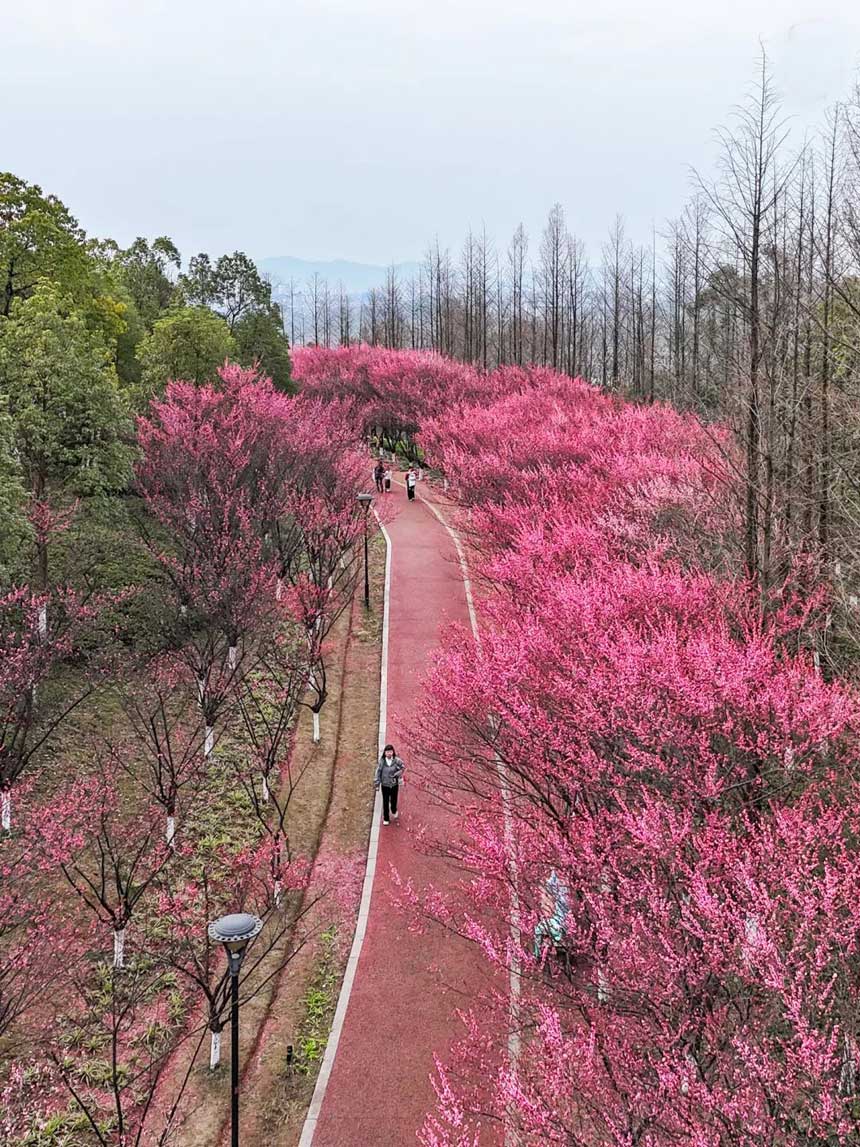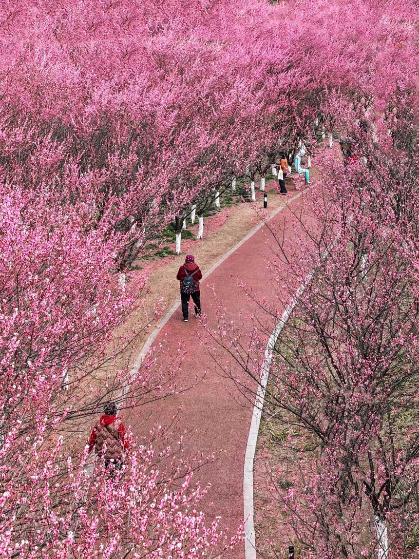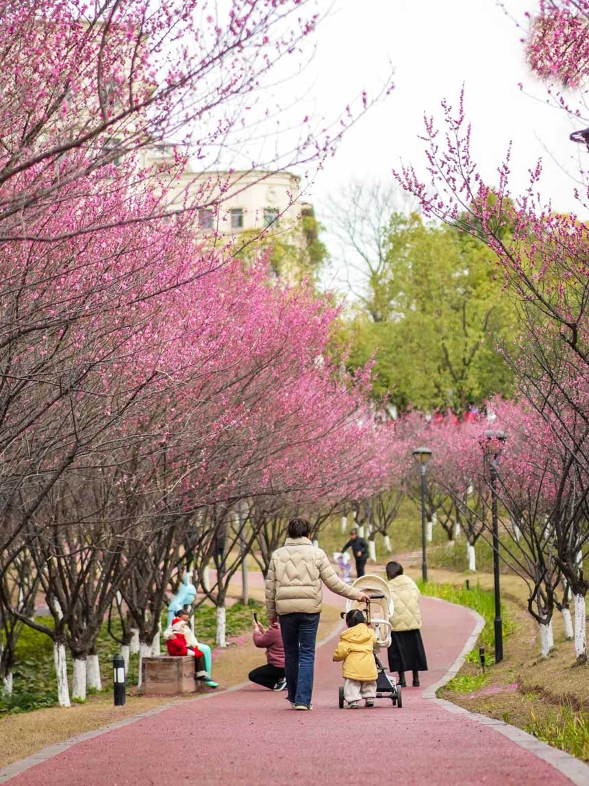 漫步小徑,腳下是濕潤(rùn)的紅色步道,抬頭是花枝交錯(cuò)的穹頂。偶有微風(fēng)拂過(guò),花瓣簌簌而落,似一場(chǎng)緋色細(xì)雨。游客極少,多為周邊的居民到此溜娃、散步,親子家庭嬉笑穿梭,將梅花編入童趣的春日記憶;偶爾有攝影愛(ài)好者架起長(zhǎng)槍短炮,記錄著梅林下的精彩瞬間;