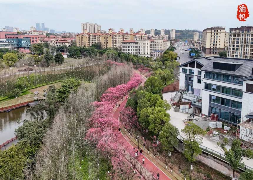 悅來(lái)會(huì)展公園顧名思義,是一個(gè)依托悅會(huì)國(guó)際會(huì)展中心而打造的一個(gè)大型城市公園,是重慶首個(gè)“海綿公園”,公園依山而建,毗鄰國(guó)博中心,將現(xiàn)代會(huì)展的繁華與自然野趣巧妙融合。園內(nèi)步道蜿蜒,心形湖碧波微漾,玉蘭、櫻花、紅葉李次第點(diǎn)綴其間,而早春的主角,非那條近200米的梅丫小徑莫屬。