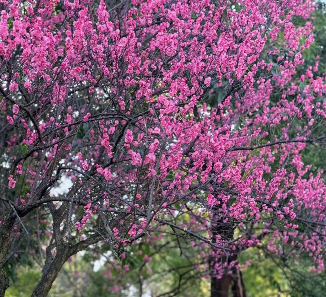 在周圍一片綠意中這棵粉梅十分出眾星星點(diǎn)點(diǎn)、粉嫩嬌俏的梅花綴滿了枝頭呈現(xiàn)出一幅勃勃生機(jī)的春日畫卷