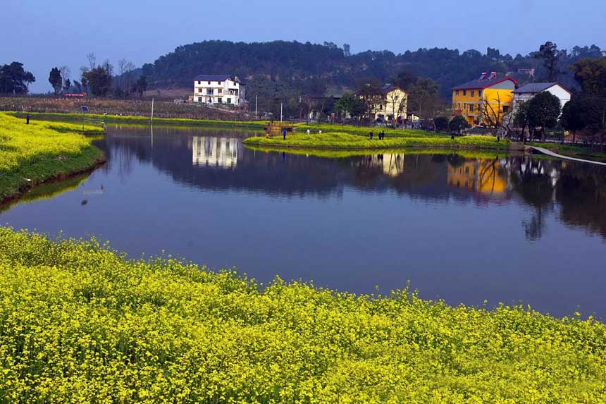 三月,在這500畝田地間油菜花恣意怒放漫山金黃,高低起伏