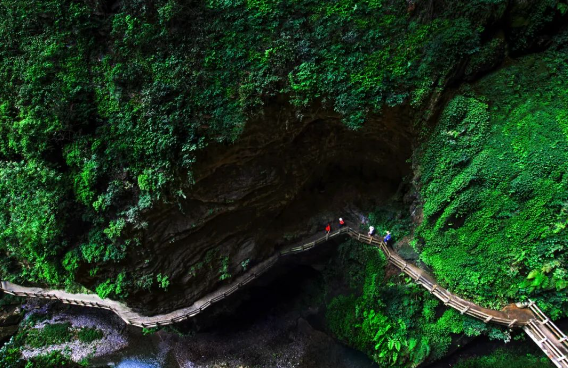 行走在懸崖棧道上抬頭是橫跨天際的巍峨石橋低頭是深不見底的幽谷碧潭仿佛下一秒就會有擎天柱從巖壁中變形而出