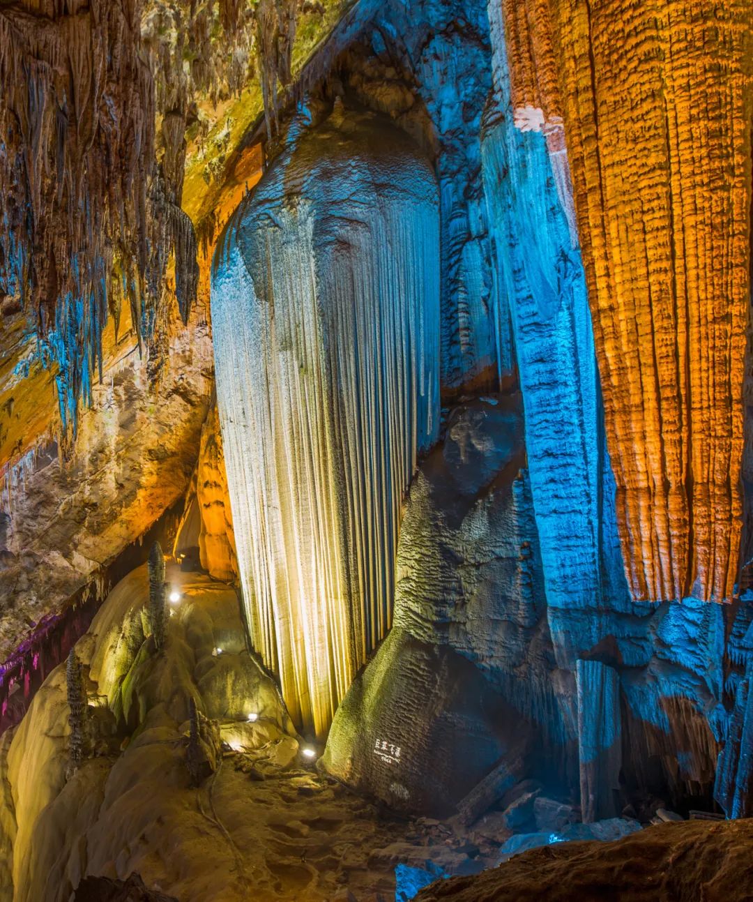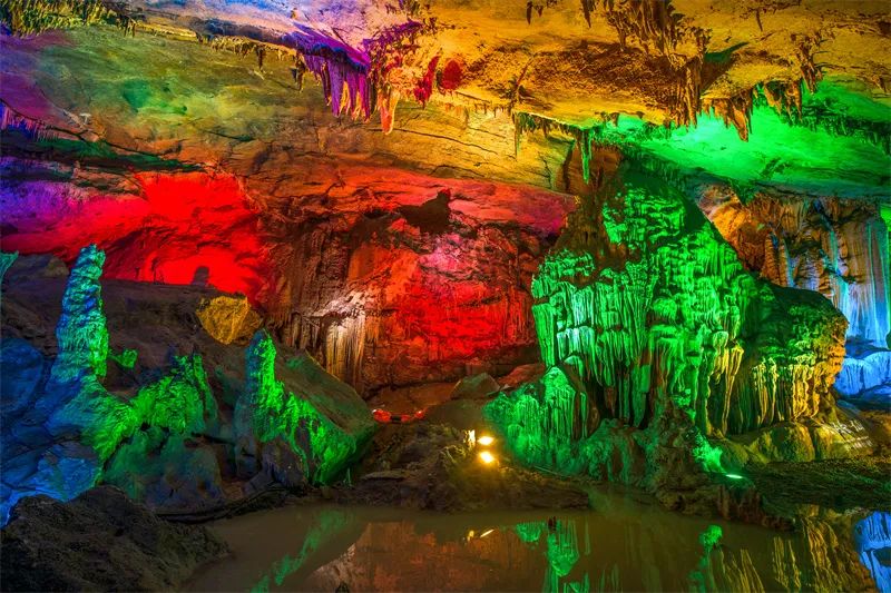 五彩燈光映照著億萬年形成的鐘乳石石瀑、石筍、石花……像一座華麗的地下水晶宮