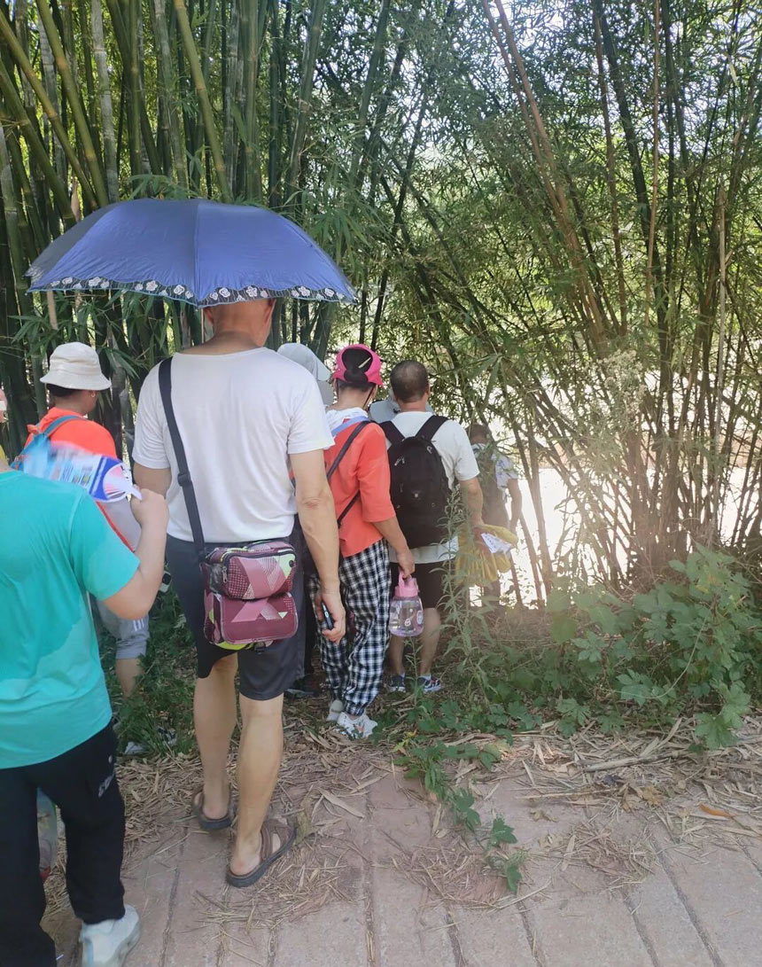 烈日高懸,男山友撐起傘,融入徒步隊伍。傘在竹林間晃動,成了獨特風景。這不是“怕曬”的矯情,是和40℃高溫較勁的灑脫——既要征服山野,也別讓陽光“欺負”自己。