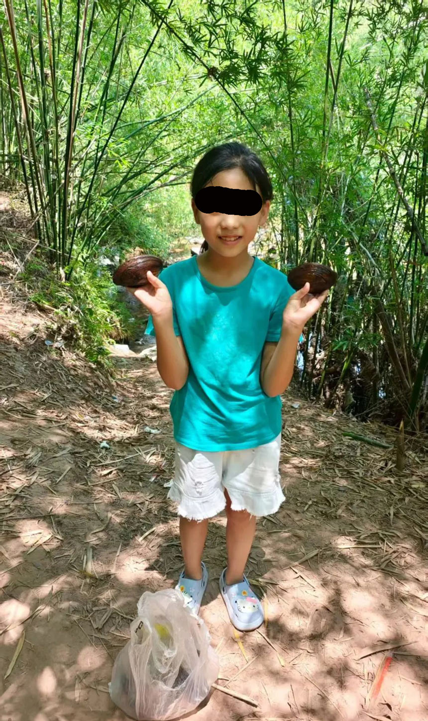 小女孩身著藍綠色短袖和白色短褲,腳穿帶卡通圖案的鞋子,站在竹林小徑上,雙手各拿著一個河蚌, 腳邊放著一個塑料袋,臉上洋溢著開心的笑容,她在參與山友們的徒步玩水活動并有所收獲。