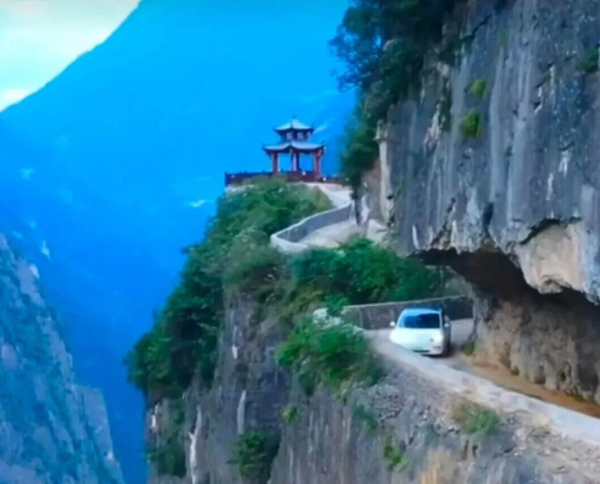 蘭英大峽谷的知名景點是掛壁天路,被譽為"中國最美掛壁公路"。這條天路切掛峽谷東側絕壁,全長1200米,寬度不足3米,一邊緊貼陡崖,一邊是萬丈深淵,如同玉帶般束縛著崖壁"老虎嘴"。