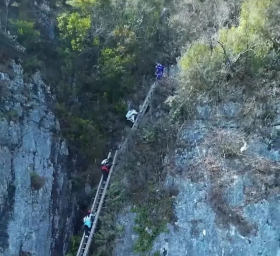 筍人天梯坐落于重慶市南川區(qū)頭渡鎮(zhèn)金佛山南坡,是當地極具特色的戶外徒步地點。其全程長度約為10-13公里,累計爬升高度在700-1000米之間,由3段木梯和2段鐵梯共同組成這一險峻的通道。金佛山作為大婁山脈北部的盡端,主峰風吹嶺海拔達2238.2米,與珠穆朗瑪、瑪雅文明、古埃及金字塔等同處于神秘的北緯30度附近,擁有喀斯特世界自然遺產、生物多樣性、佛教文化三大奇觀,還成功獲評國家5A級旅游景區(qū)等多項殊榮,而筍人天梯正是這片神奇區(qū)域中一處獨特的存在。筍人天梯的徒步路線具有一定的挑戰(zhàn)性,木梯部分保持著原始風貌,用木板、木棒、木棍穿斗或捆綁而成,部分看起來搖搖欲墜,但踩上去卻異常結實,每次僅能容納一人爬行;鐵梯則為下行路段增加了一定的安全性,但也讓恐高者面臨不小的考驗。整個徒步過程中,爬山時需專注前行,不敢回望背后深淵,下山時則要直面懸崖,常使人膝蓋酸軟、小腿顫抖。在徒步過程中,沿途可欣賞到千米絕壁和懸崖的險峻風光,崖下是蔥郁的樹林,生機盎然。行至頭渡鎮(zhèn),還能看到開闊的金山湖,湖水碧綠清澈,青山倒映其中,碧波如洗,觀之令人神清氣爽。此外,接近山頂時,還能看到翠竹森森的金佛山腹地景色,以及在竹海叢中偶爾驚艷眼球的喇叭杜鵑,讓徒步者在挑戰(zhàn)自我的同時,盡享大自然的饋贈。
