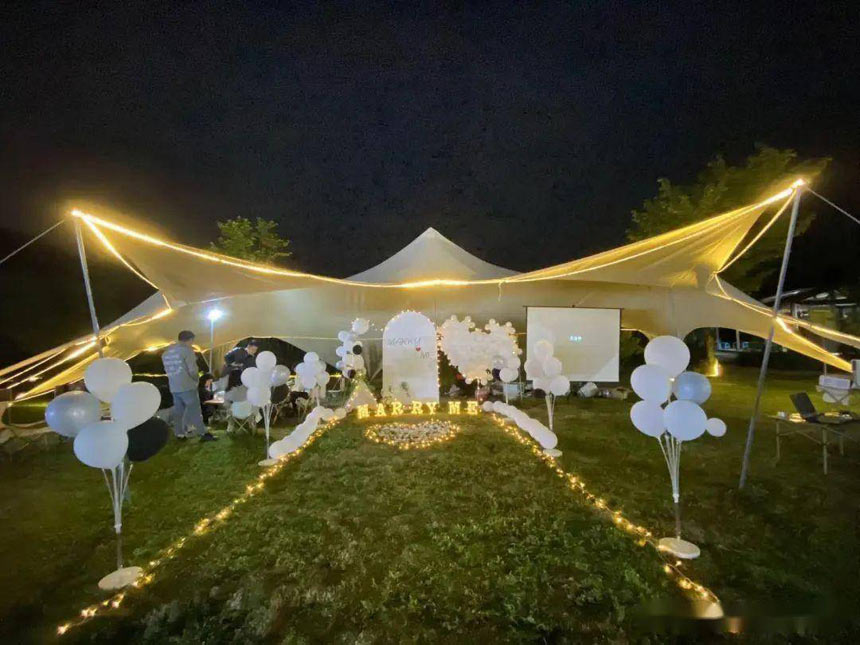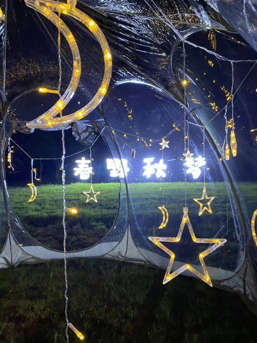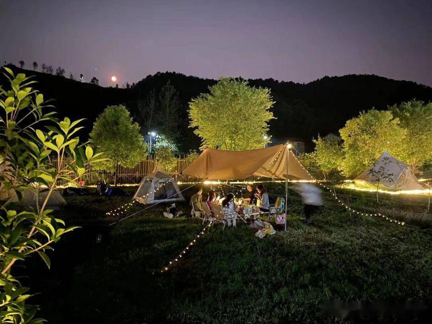 2.露營:草坪功能分區(qū)很明確,有1號大草坪適合團建、包場,2號草坪周圍全是喬木大樹,非常適合搭建天幕、帳篷、吊床等等,3號草坪私密性較好,非常適合家庭親子活動。
