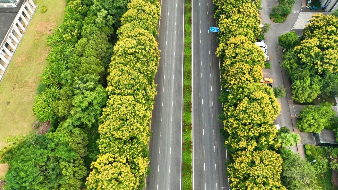 水土街道方正大道兩側(cè)密密麻麻排列著的小黃花延綿近2公里粉紅的蒴果綴在枝頭,宛如小燈籠