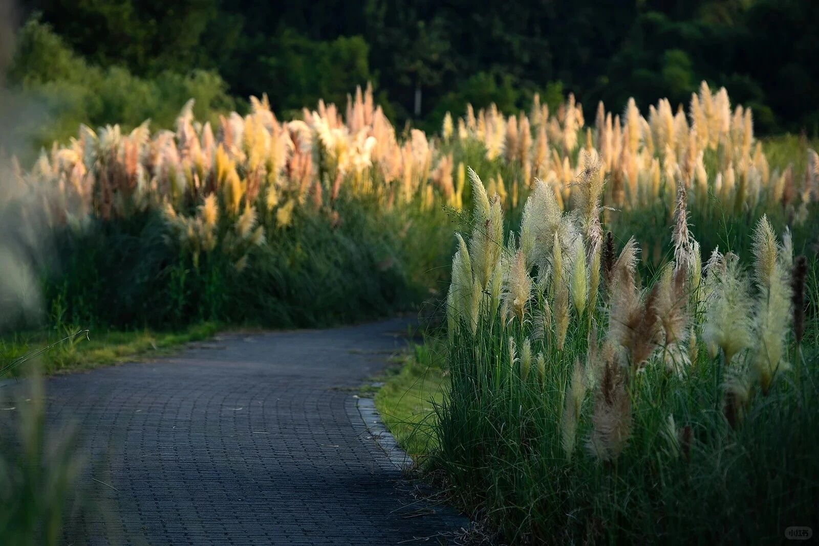 北碚竹溪河公園里一叢叢閃亮的蒲葦隨風搖曳夕陽灑下柔和金光,宛如一片波浪