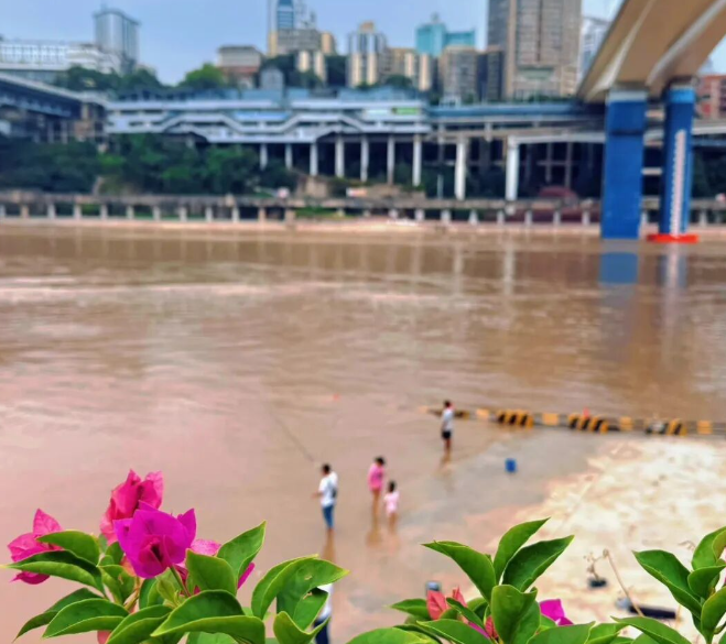 江邊一條馬路延伸進水中有一些釣魚愛好者站在水中釣魚也有家長在這里遛娃建議汛期盡量不要靠近水邊