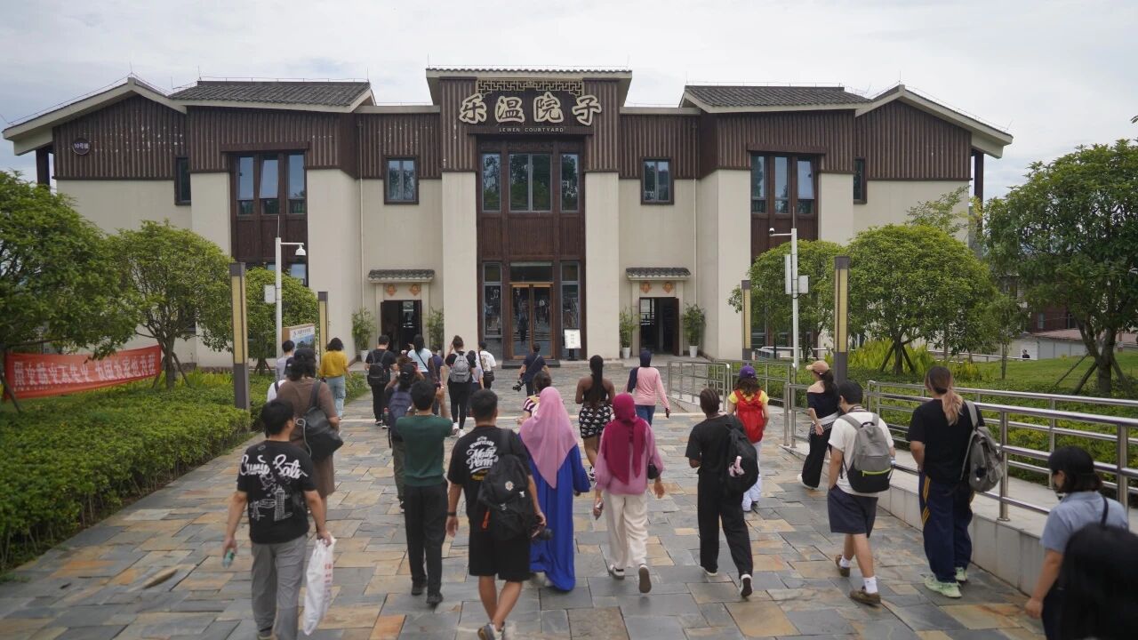 留學生們踏入三大主題園林百壽園內“壽” 字雕塑錯落成趣墨韻與綠意交織,指尖輕觸雕紋似與千年文脈對話