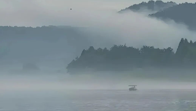 我甚至無(wú)須像過(guò)去的旅游那般,挨個(gè)打卡這里被標(biāo)號(hào)的那幾個(gè)景點(diǎn),比如它的怪石迷宮、水月洞天、玉龍神劍等等地方,我只需往江邊一坐,對(duì)著江面發(fā)呆,我就能感受到這里最美的江南風(fēng)情。而這,就是周家寨最讓我動(dòng)心迷戀的原因。觀乎斯江,宜晨宜昏。絕佳之際當(dāng)取云升霧漫之時(shí)。