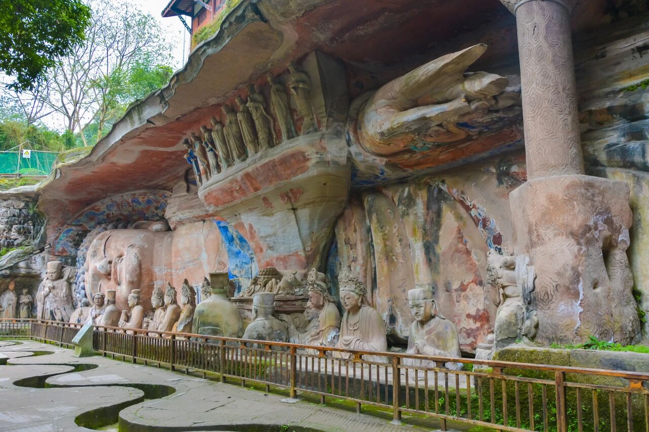 大足石刻是重慶大足區(qū)境內(nèi)石窟寺及石窟造像的總稱,是集儒、釋、道三教造像于一體的大型石窟造像群。寶頂山石刻景區(qū)以寶頂山石刻為主體,包括圣壽寺、廣大寺等千年古剎,以及大足石刻博物館、老街、仿宋街等文博展館和購(gòu)物街區(qū),是集觀光、旅游、度假于一體的世界遺產(chǎn)特色文化景區(qū)。
