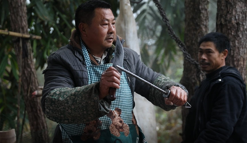 將豬從豬圈趕至屠宰地點是一項頗費周折的任務。豬通常不會順從地跟隨,因此需要人們齊心協(xié)力,或抓耳朵,或拽尾巴,以防止其亂拱,確保能夠穩(wěn)妥地抓住并控制住它,防止其亂竄。