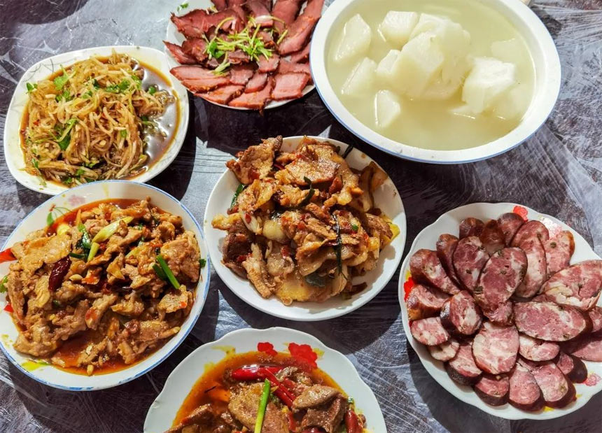 既然是殺豬宴,那自然少不了以豬肉為主角的各式佳肴。炒豬肝的鮮嫩,排骨燉蘿卜的醇厚,木耳炒肉的爽口,以及紅燒肥腸的肥而不膩,每一道都讓人垂涎欲滴。