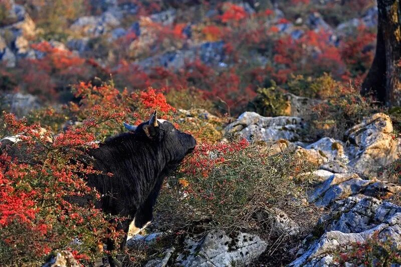 草場(chǎng)上自在的牛羊穿梭于火棘之中,悠閑地啃食,一幅自然和諧的畫面令人心情愉悅。