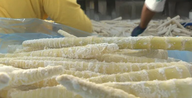 秋日來臨,筍農(nóng)便在高山之上搭建起簡(jiǎn)易的筍廠。采筍是項(xiàng)充滿韻律的勞動(dòng)。山中回蕩著嘹亮的山歌與號(hào)子,筍農(nóng)目光如炬搜尋合適的竹筍。只見他們或伸手輕拽筍尖,或用腳巧踩筍根,順勢(shì)以筍刀削去一側(cè)筍殼,再用手腕靈巧一絞,一根裹著晨露、鮮嫩欲滴的方竹筍便完整剝離出來。