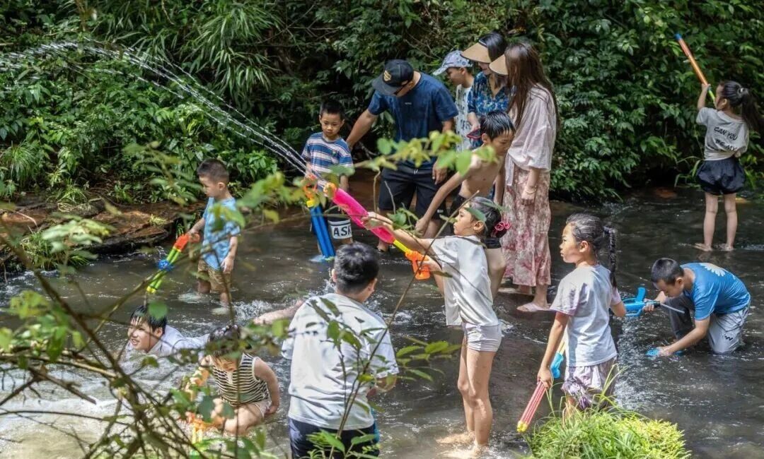 仙霧秘境有著條淺淺的小溪,可以蹲在石邊輕輕扒開石頭找螃蟹抓小魚,偶爾抓起一只小螃蟹,舉起來給孩子看,螃蟹舉著小鉗子往石縫里躲的模樣,惹得大家笑個不停。