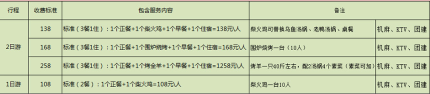 套餐一、2日游 138 標(biāo)準(zhǔn)(3餐1住):1個(gè)正餐+1個(gè)柴火雞+1個(gè)早餐+1個(gè)住宿=138元人 柴火雞可替換烏魚湯鍋、老鴨湯鍋、桌餐 機(jī)麻、KTV、團(tuán)建