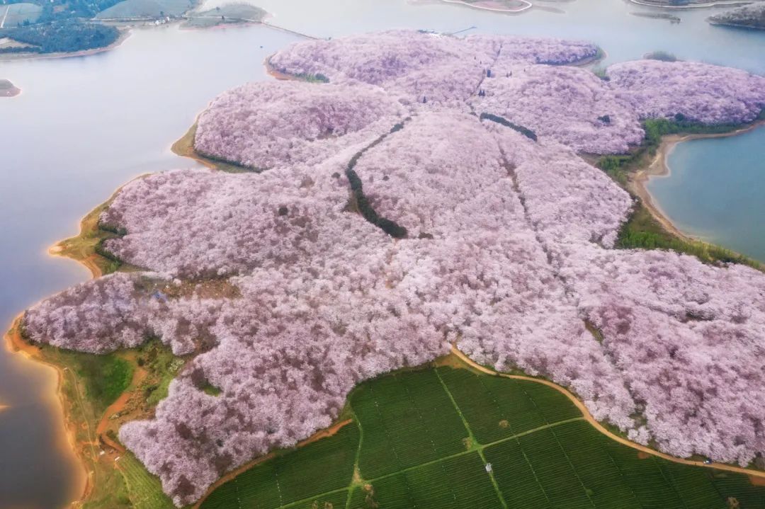 上萬(wàn)畝櫻花被紅楓湖分割成了許多個(gè)獨(dú)立小島,湖光、花色相輔相成,更添了一些精致和趣意。