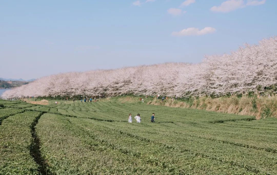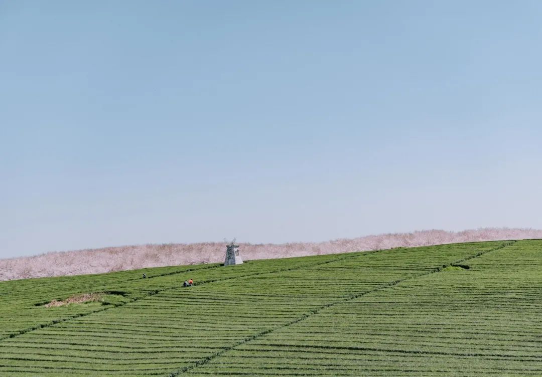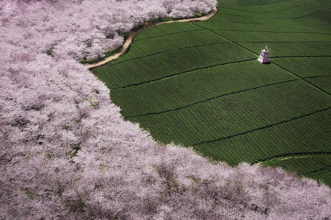 粉色櫻花和草綠色茶園毫無(wú)違和感地拼接在一起,遠(yuǎn)處是連綿的青山,讓人想醉倒在這里。