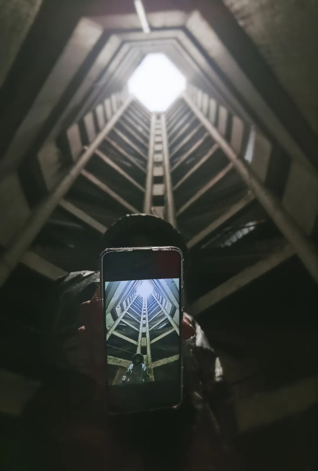 樓底必拍,需要用手機(jī)廣角鏡頭才能拍全,可先拍一張人照,再手持照片用另一設(shè)備拍,形成畫中畫的效果;其他樓層的拍攝需要對(duì)稱才好看。