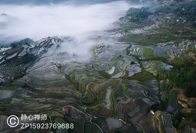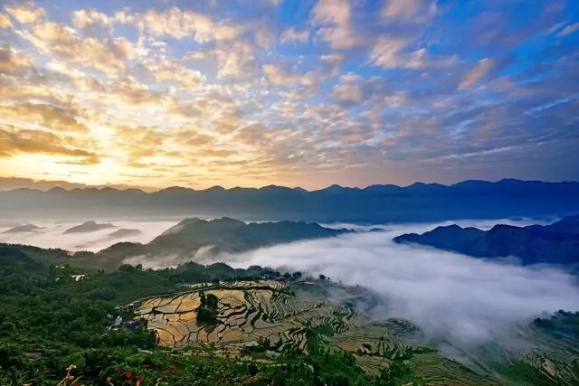 而在稻谷還未成熟之時,煙霧籠罩,青翠點(diǎn)染,夾著雞鳴狗吠,山歌清脆,宛若一幅極具鄉(xiāng)村韻味的山水田園畫。