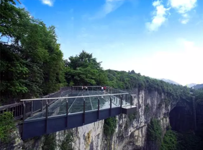 天坪武隆天生三硚玻璃觀景眺臺位于海拔1200米高的崖頂,向外懸挑11米,長度26米,距離懸崖底部垂直高度為280米。由20多位國內外一流專家規(guī)劃、設計,是目前世界單塊面積最大的懸崖玻璃眺臺。