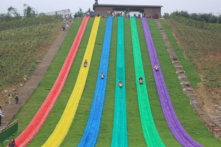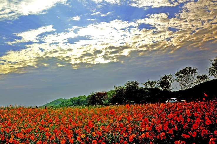 四季花海以色彩堆積出來的300畝花的海洋。在每年4月至6月,你將看到由虞美人、鳶尾、毛地黃、鈴蘭、毛更、波斯菊等為主織就的花海。每年的8月至10月,你或?qū)⒖吹较蛉湛⒆隙∠、石竹、百合等色彩繽紛的花朵。花海還提供婚紗攝影等服務。