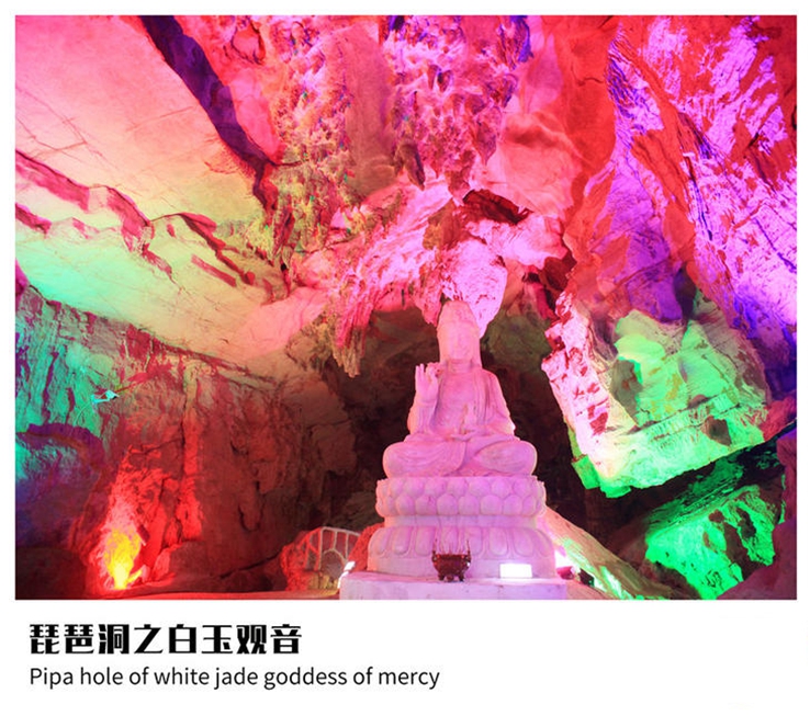 琵琶洞:五彩斑斕的琵琶洞是景區(qū)的一大招牌,洞分三層,長約2000余米,洞內(nèi)一般高度、寬度均達(dá)10余米,最高處可達(dá)30余米,最大廳堂達(dá)數(shù)百平方米,最窄處僅容一人側(cè)身而過。