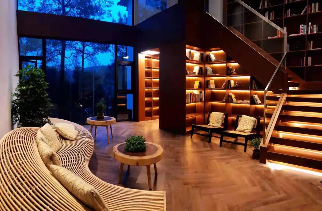 大廳內(nèi)全實(shí)木家具,木香與室外的氣息是一致的,大廳兩邊是全落地窗,通透,室內(nèi)外全然沒(méi)有阻隔,人與自然就這樣全然融合。坐在那里,忘記時(shí)間的存在,時(shí)光就這樣慢下來(lái),與爾漫步云天。
