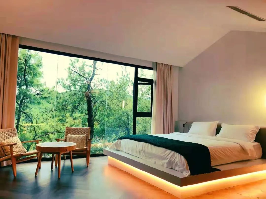 慢漫崖居設(shè)計(jì)讓人與自然全然融合。民宿內(nèi)每間客房都是大落地窗,滿眼的蒼翠,那是遠(yuǎn)山和眼前的松柏,與自然共吐納,身心都浸泡在綠色里,生命由此得到全然的滋養(yǎng)。