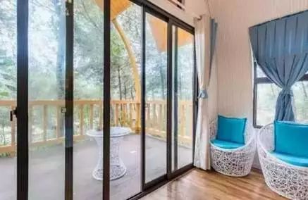 小木屋里面是落地窗,窗外就是樹林,這樣的環(huán)境美極了。